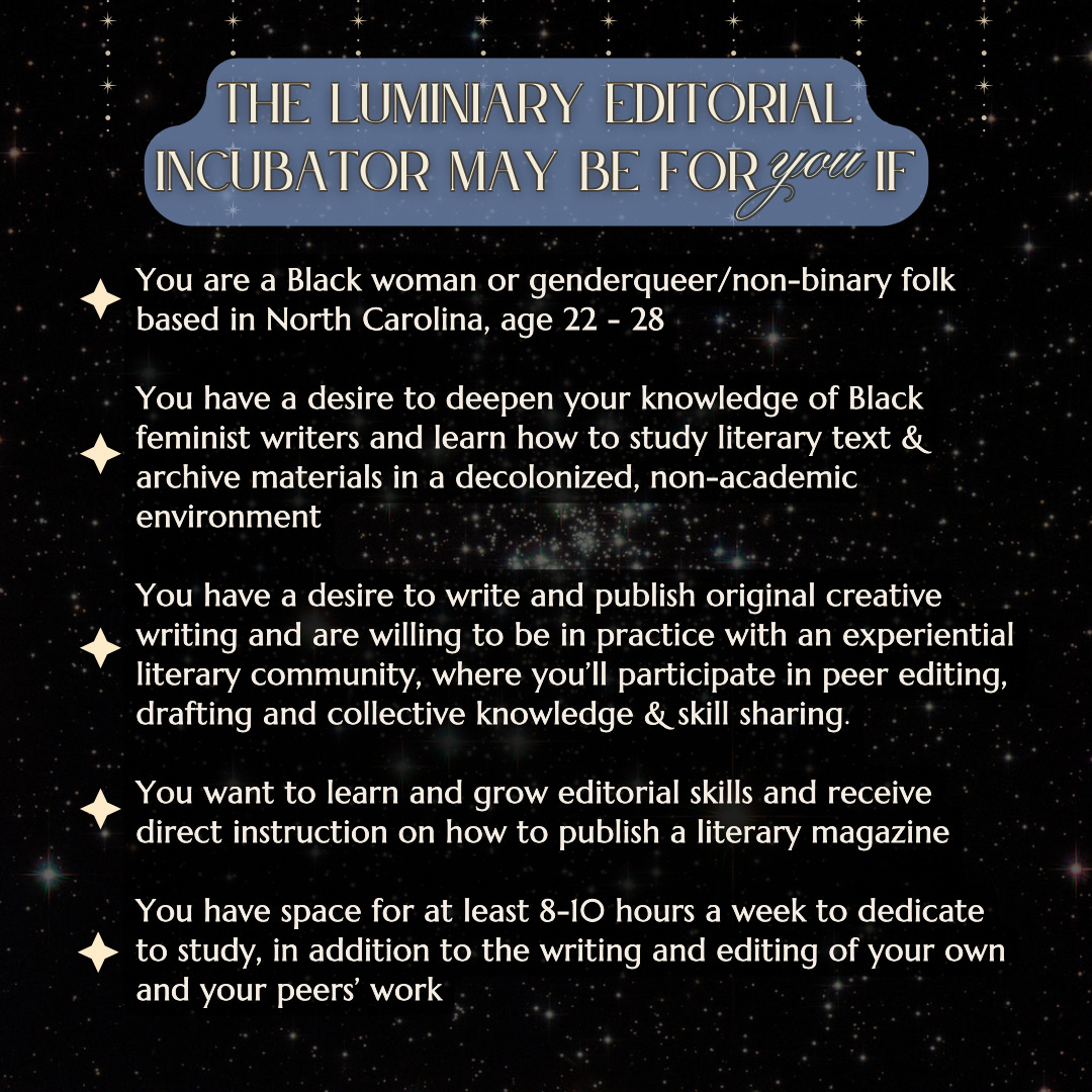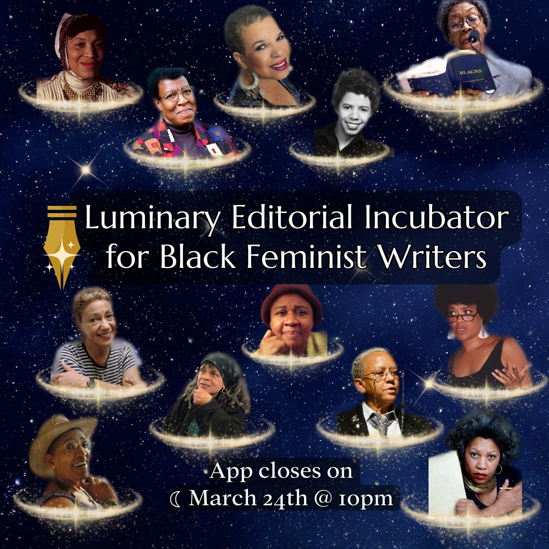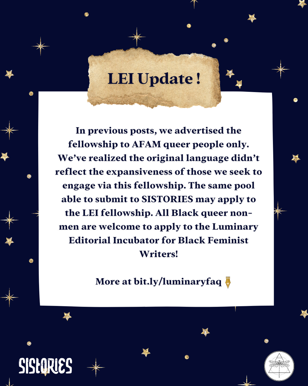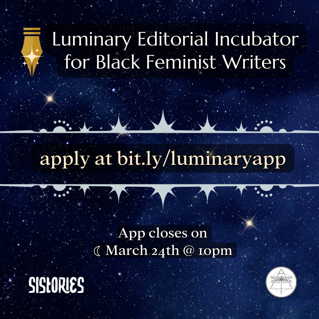 As part of this program, I’m stewarding the Luminary Editorial Incubator for Black Feminist Writers (LEI). This fellowship is my latest contribution to the collective in the curation of spaces I believe have the power to shape change within our hearts, minds and communities. LEI is both a study & publishing incubator, with the amazing staff of SISTORIES operating as editorial mentors, and some comrades I deeply admire to support the Luminary fellows in designing and developing a study plan for their time within the incubator.